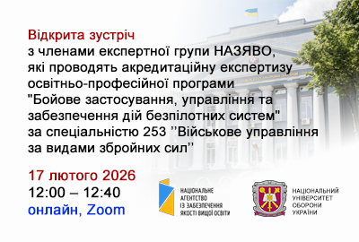 В Національному університеті оборони України у період з 03 по 05 лютого 2026 року проводитиметься акредитація освітньо-професійної програми "Бойове застосування, управління та забезпечення дій безпілотних авіаційних систем" за спеціальністю 253 ʼʼВійськове управління за видами збройних силʼʼ.